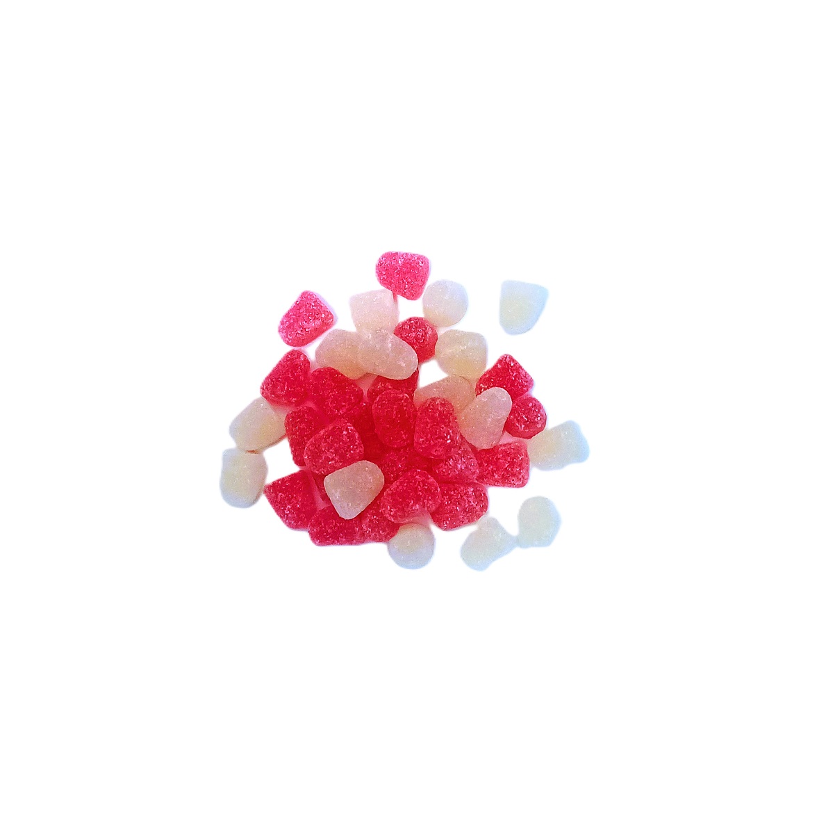 Sucres (sirop de glucose, sucre), eau, gélatine, glycérol, acide citrique, arômes artificiels, acide malique, dioxyde de titane, pectine, huile de palme (RSPO), cire de carnauba, rouge allura. Peut contenir : Produits laitiers et soya.