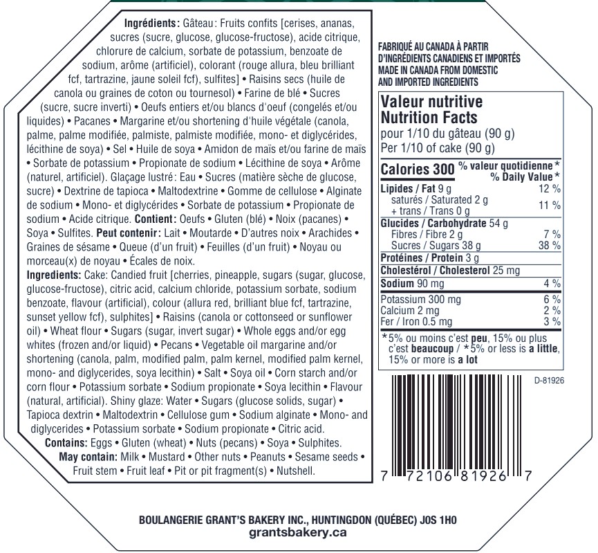Deluxe fruitcake with pecans from Grant’s Bakery is made with red and green glacé cherries, raisins, golden glacé pineapple and lots of pecans, of course !