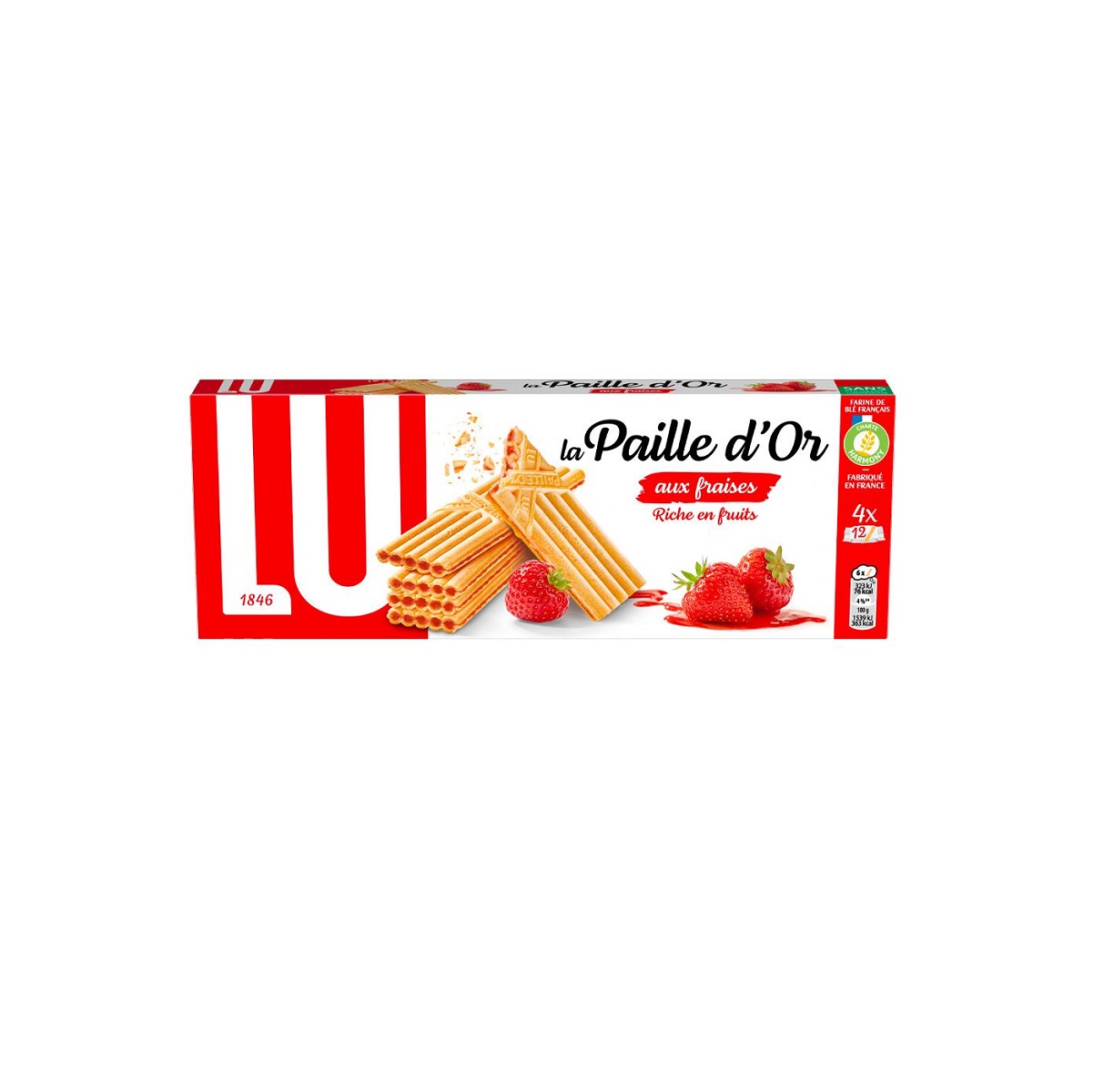 Gaufrettes croustillantes fourrées à la fraise. Environ 6 biscuits par boîte.