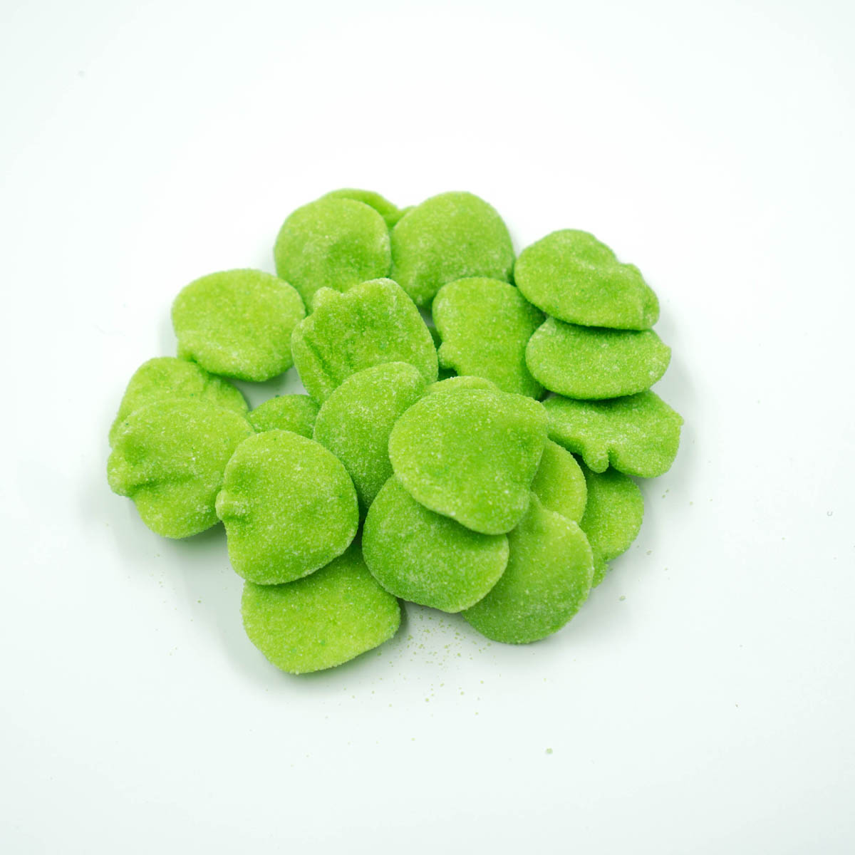 Pot Mason rempli de bonbons sucrés et/ou acidulés de couleur verte.
